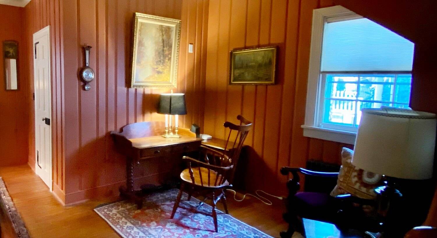 Corner nook of home with wood paneled walls, a writing desk with chair and lamp and one window with blinds